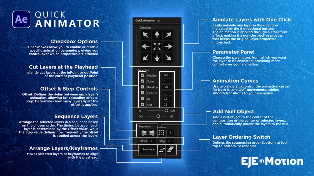 Quick Animator is a powerful After Effects script designed to speed up your workflow by letting you animate layers with just one click. Using a non-destructive Transform effect, it offers full control over animation parameters, sequencing, and layer organization.