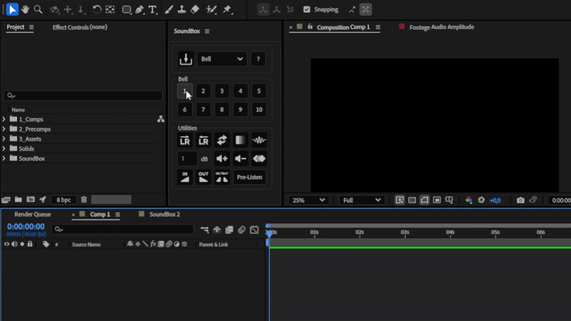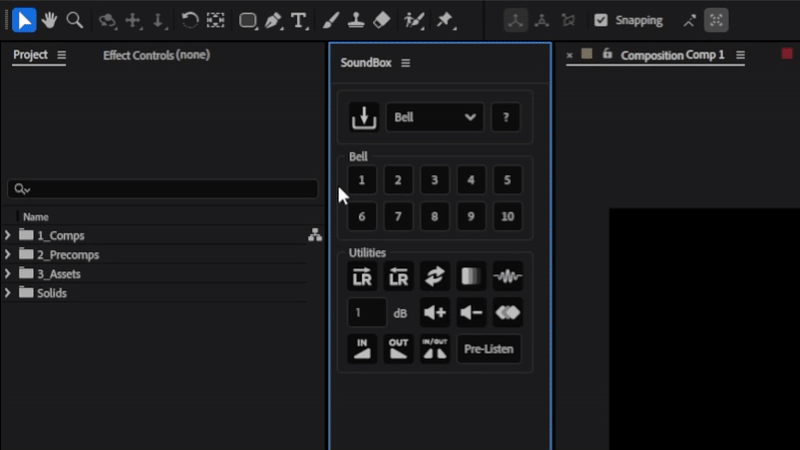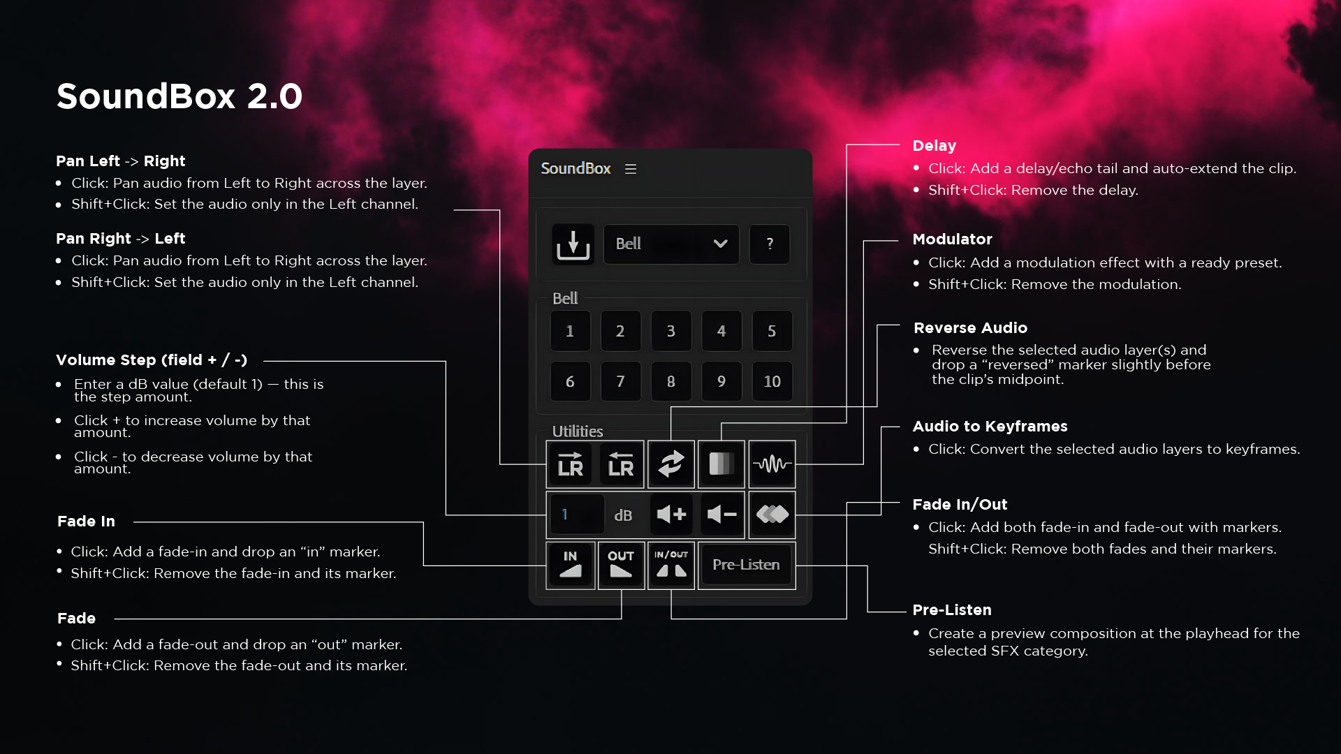 Preview, drop, and polish sound effects without leaving AE. Pans, fades, reverse, delay, modulator, volume nudges, and “audio-to-keyframes”—all in one panel.